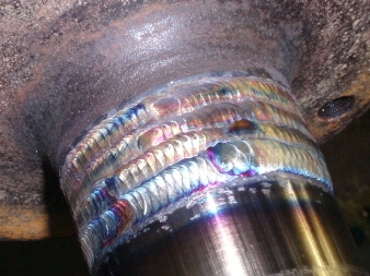 http://www.jdcrawlers.com/uploads/p1010 ... ed__31.jpg[/img][url] After much thought and consulting I decided to use GTAW(tig ) with 309L ss filler metal. ESAB rep recommended powder spray but we concluded my model B torch was too small for the size of the shaft. His next choice was GTAW using a 300degree F mininum pre heat. He belives that the axle is probably 4130 material. It took two passes to fill up the groove and give me .070 extra to machine down. As the gold and purple colors indicate the heat input was kept to a minimum. The 309L wire welded smooth with no fusion issues. I used 3/32" filler. Had some 1/8" but chose the smaller to keep the heat input down.